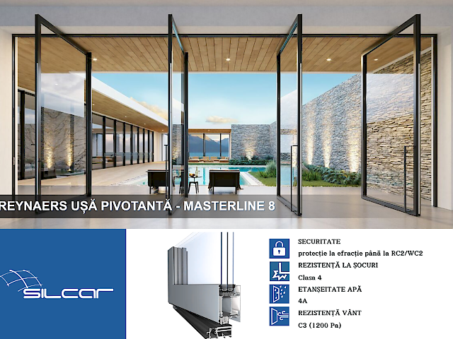 Usile pivotante MasterLine 8 din aluminiu combina un design modern cu performante remarcabile in materie de siguranta, izolare termica si robustete structurala. Acestea reprezinta o optiune ideala pentru intrarile principale, fiind disponibile in versiuni standard, intr-un format XL de mari dimensiuni, precum si intr-o varianta modulara, cu panouri multiple interconectate pentru un efect arhitectural spectaculos.