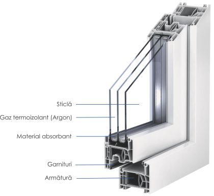 Profilul PVC al ferestrei include armături metalice interne, care au rolul de a oferi rigiditate și stabilitate structurală întregului sistem.